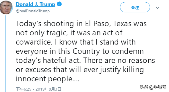 今天在德克萨斯州埃尔帕索发生的枪击事件不仅是悲剧,也是懦弱的表现。我知道我和这个国家的每个人站在一起谴责今天的仇恨行为。没有任何理由或借口可以为杀害无辜的人辩护……